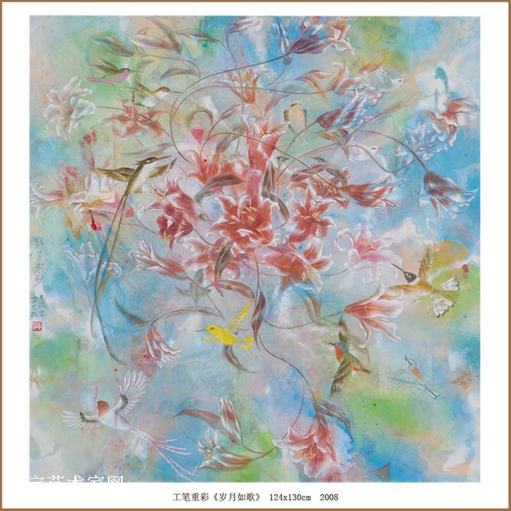 花鸟画作品在追求中国传统文化精神内涵的同时,更强调作品的当代品格。在艺术观念、作品图式、色彩表达等方面,力争突破传统中国工笔花鸟画的表现模式以及流行式样。其新颖、独特的绘画语言,拓展了中国当代工笔花鸟画新的审美空间。